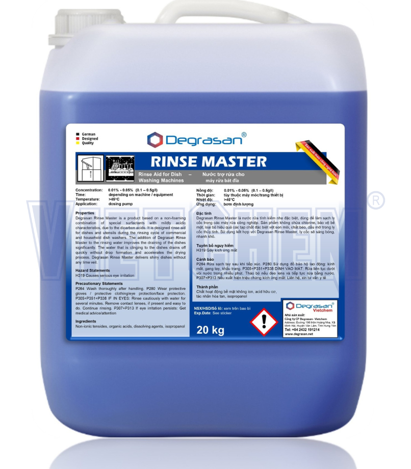 nghiệp. Thành phần của Degrasan Rinse Master là sự kết hợp của các chất hoạt động bề mặt cùng với acid nhẹ. Sản phẩm được thiết kế thích hợp cho quy trình tráng của máy rửa chén bát, công thức cải tiến giúp bát đĩa nhanh khô hơn, không để lại cặn nước, giúp bát đĩa được sáng bóng.